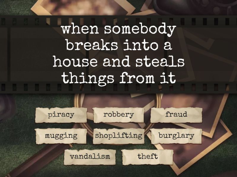 burglary - when somebody breaks into a house and steals things from it, fraud - when you trick somebody to get money or something from them, mugging - when somebody takes a person's money or posssessions using violence, piracy - when somebody copies software such as CDs and DVDs illegally, robbery - when somebody steals from a bank account or a person, shoplifting - when somebody takes things from a shop without paying, theft - when somebody steals something, vandalism - when somebody damages public property,