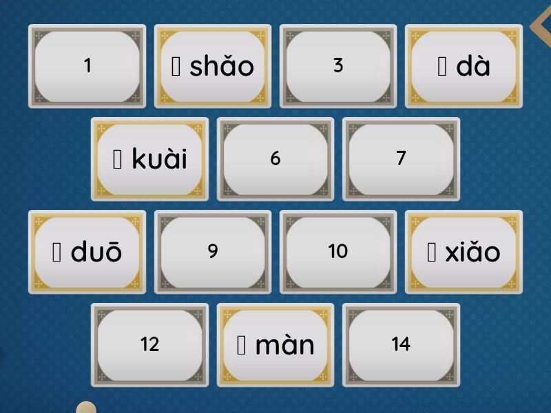 多 duō - 少 shǎo, 大 dà - 小 xiǎo, 快 kuài - 慢 màn, 胖 pàng - 瘦 shòu, 高 gāo - 矮 ǎi, 饿 è - 饱 bǎo, 贵 guì - 便宜 piányi,