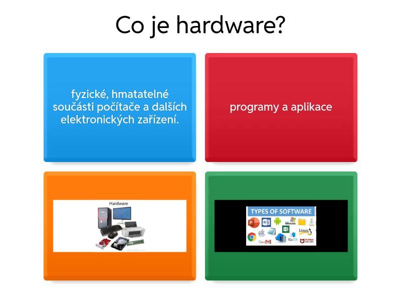 1) Co je hardware? a) fyzické, hmatatelné součásti počítače a dalších elektronických zařízení. b) programy a aplikace c) d) 2) Co je Informatika? a) vědní obor, který se zabývá historií pravěku b) vědní obor, který se zabývá metodami zpracování informací a prostředky k tomu určenými, včetně hardwarového a softwarového vybavení počítačů. 3) Co je operační systém? a) chirurgický nástroj b) klávesnice počítače c) základní software, který řídí a spravuje hardware počítače nebo jiného zařízení a umožňuje uživateli spouštět aplikace. 4) Co znamená algoritmus? a) tanec b) přesný návod nebo postup, který krok za krokem řeší určitý typ úlohy. 5) Co znamená digitální stopa? a) stopa, která zůstane po pádu počítače na zem b) souhrn všech informací, které po sobě zanecháváme při online aktivitách, ať už vědomě (aktivní stopa, jako jsou příspěvky na sociálních sítích) nebo nevědomě (pasivní stopa, jako jsou cookies a historie prohlížení) c) elektronická bota d) přesný postup, jak programovat aplikaci