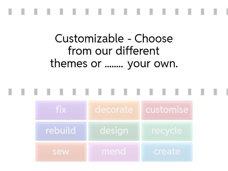 create - Customizable - Choose from our different themes or ........ your own., customise - You can ............ the information that appears here, by changing your Preferences., decorate - They could ................. the room any way they wanted., design - The .......... of the hotel combines an elegant blend of contemporary ............ with a modern Thai touch to ensure a relaxing stay for all guests, mend - One thousand gold pieces if you can.......... our android., rebuild - I can .......... it, but we're talking weeks, maybe months., recycle - Many options exist to improve on-site sanitation and ........... human waste, especially in rural areas., sew - Then you.......... up the hole and make his bed again., fix - Oh,no! I've just broken my phone. I'd better take it back to the shop and see if they can........it.,