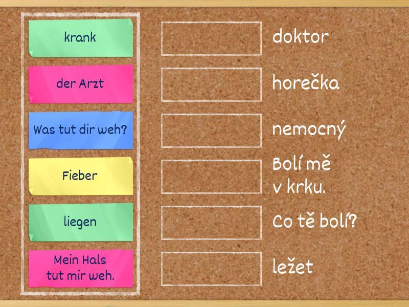 krank - nemocný , gesund - zdravý , Fieber - horečka , telefonieren - telefonovat , der Arzt - doktor , sofort, schnell - rychle, Was tut dir weh?  - Co tě bolí? , aufstehen - vstávat , schlafen - spát , liegen - ležet , bleiben - zůstat , Mein Hals tut mir weh. - Bolí mě v krku. ,