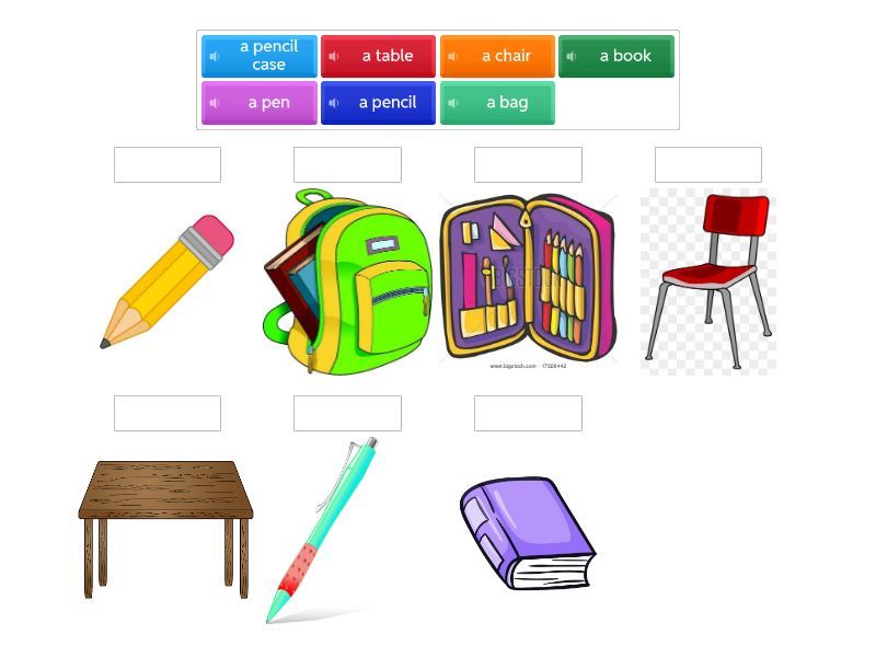 a bag, a pencil case, a pen, a book, a chair, a table, a pencil,