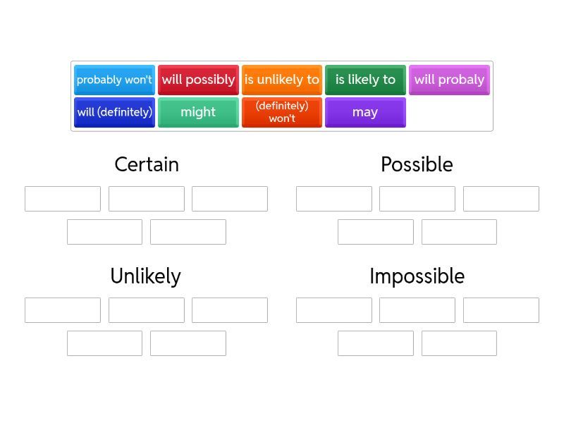 Certain: will (definitely), Possible: will probaly, will possibly , may, is likely to, might, Unlikely: is unlikely to, probably won't , Impossible: (definitely) won't ,