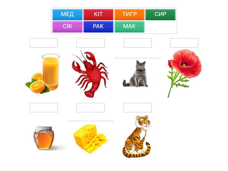 РАК, МАК, СІК, СИР, КІТ, ТИГР, МЕД,