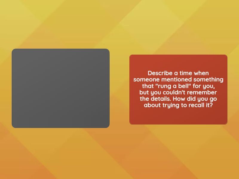 Have you ever had someone give you important advice, but it went "in one ear and out the other"? What was the advice, and why do you think you didn't remember it?, Can you recall a time when something important "slipped your mind"? What was it, and how did you react when you realized you forgot it?, When was the last time you needed someone to "refresh your memory" about something? What was it, and how did they help you remember?, Can you think of a situation where the answer to a question or a word you wanted to say was "on the tip of your tongue," but you couldn't quite remember it? What was the context?, Describe a time when someone mentioned something that "rung a bell" for you, but you couldn't remember the details. How did you go about trying to recall it?, Have you ever felt like your "memory was playing tricks on you"? Share an experience when you couldn't trust your memory, and how did you handle it?.