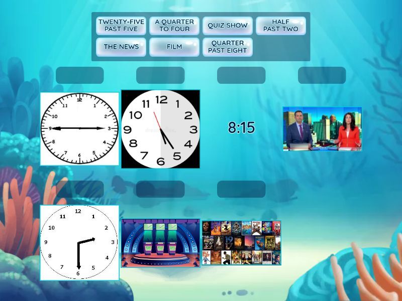 COOKERY PROGRAMME, DOCUMENTARY, FILM, QUIZ SHOW, TALENT SHOW, THE NEWS, CARTOONS, MUSIC PROGRAMME, EIGHT O'CLOCK, HALF PAST TWO, A QUARTER PAST THREE, A QUARTER TO FOUR, TWENTY-FIVE TO FIVE, TWENTY-FIVE PAST FIVE, TEN TO TEN - 9:50, TEN PAST TEN - 10:10, HALF PAST NINE - 9:30, ONE O'CLOCK - 01:00, QUARTER TO TWELVE - 11:45, QUARTER PAST EIGHT - 8:15, QUARTER TO NINE - 8:45,
