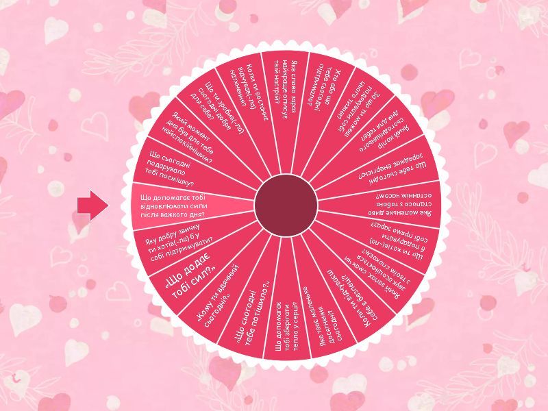 1) Що сьогодні подарувало тобі посмішку? 2) Який момент дня був для тебе найспокійнішим? 3) Що ти зробив(-ла) сьогодні добре для себе? 4) Коли ти востаннє відчував(-ла) натхнення? 5) Яке слово зараз найкраще описує твій настрій? 6) Хто або що тебе сьогодні підтримало? 7) За що ти можеш подякувати собі цього тижня? 8) Який колір сьогоднішнього дня для тебе? 9) Що тебе сьогодні заряджає енергією? 10) Яке маленьке диво сталося з тобою останнім часом? 11) Що ти хотів(-ла) б подарувати собі прямо зараз? 12) Який запах, смак чи звук асоціюється з твоїм спокоєм? 13) Коли ти відчуваєш себе в безпеці? 14) Яке твоє маленьке досягнення сьогодні? 15) Що допомагає тобі зберігати тепло у серці? 16) «Що сьогодні тебе потішило?» 17) «Кому ти вдячний сьогодні?» 18) «Що додає тобі сил?» 19) Яку добру звичку ти хотів(-ла) б у собі підтримувати? 20) Що допомагає тобі відновлювати сили після важкого дня?