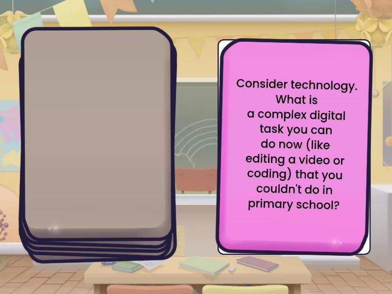 Think about sports or physical skills. What is something you can do easily now that you couldn't do when you were younger?, Consider technology. What is a complex digital task you can do now (like editing a video or coding) that you couldn't do in primary school?, Reflect on school subjects. What is a subject you can understand well now that you couldn't grasp last year?, Talk about food. What is a food you can eat now that you couldn't stand as a child?, Think about personal independence. What is an errand or task you can do for yourself now that you couldn't do without help before?, Consider your hobbies. What is a specific technique in your hobby (e.g., a drawing style, a gaming move) you can do now that you couldn't manage before you practiced?.