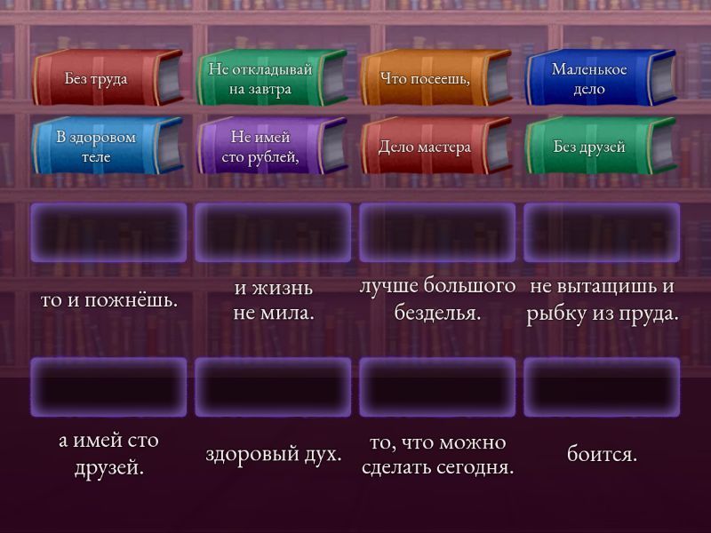 Без труда - не вытащишь и рыбку из пруда., Ученье — свет, - а неученье — тьма., Дело мастера - боится., Терпение и труд - всё перетрут., Друг познаётся - в беде., Век живи — - век учись., Не имей сто рублей, - а имей сто друзей., Что посеешь, - то и пожнёшь., Лучше синица в руках, - чем журавль в небе., За двумя зайцами погонишься — - ни одного не поймаешь., Без друзей - и жизнь не мила., Маленькое дело - лучше большого безделья., Слово — не воробей, - вылетит — не поймаешь., Поспешишь — - людей насмешишь., Где дружба, - там и сила., Работа не волк — - в лес не убежит., Не откладывай на завтра - то, что можно сделать сегодня., Под лежачий камень - вода не течёт., Яблоко от яблони - недалеко падает., Сколько людей — - столько и мнений., Лес рубят — - щепки летят., В здоровом теле - здоровый дух., Кто рано встаёт, - тому Бог подаёт.,