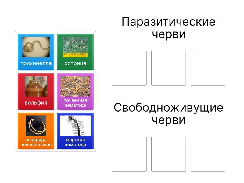 Паразитические черви: аскарида человеческая , острица, трихинелла, Свободноживущие черви: вольфия, морская нематода, почвенная нематода ,