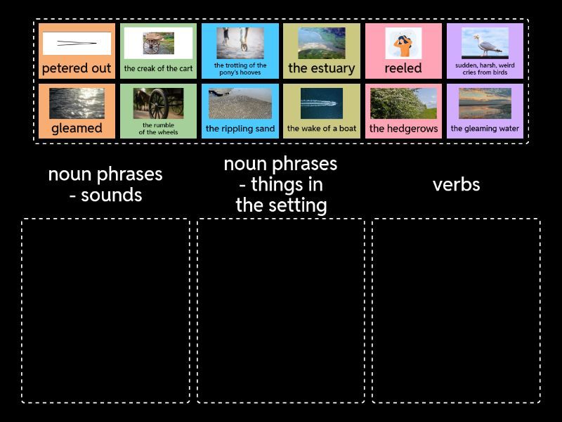 noun phrases - sounds: the trotting of the pony's hooves, the rumble of the wheels, the creak of the cart, sudden, harsh, weird cries from birds, noun phrases - things in the setting: the estuary, the wake of a boat, the rippling sand, the hedgerows, the gleaming water , verbs: reeled, gleamed, petered out,