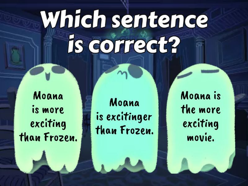 1) Which sentence is correct? a) Moana is more exciting than Frozen. b) Moana is excitinger than Frozen. c) Moana is the more exciting movie. 2) Complete the sentence: Encanto is __________ than Frozen. a) colorfuller b) more colorful c) the most colorful 3) Which sentence uses the superlative form correctly? a) Avengers is the excitingest movie. b) Avengers is most exciting than Spiderman. c) Avengers is the most exciting movie. 4) Fill in the blank: Frozen is as __________ as Moana. a) good b) better c) best 5) Choose the correct comparison: Spiderman is __________ than Batman. a) braver b) the bravest c) as brave as 6) Which one is a superlative sentence? a) Moana is as long as Frozen. b) Frozen is longer than Encanto. c) Encanto is the longest movie. 7) Choose the correct form: This movie is __________ than the one we watched yesterday. a) more sad b) sadder c) the saddest 8) Which of these sentences shows equality? a) Moana is better than Frozen. b) Frozen is as funny as Encanto. c) Encanto is the funniest movie. 9) Fill in the blank: Among all the movies, Frozen is __________. a) more good b) the best c) better 10) This movie is __________ than the last one we watched. a) good b) best c) better
