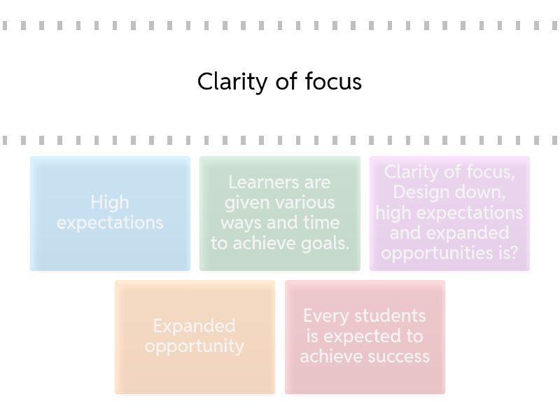 High expectations  - Clarity of focus , Every students is expected to achieve success - Teaching is guided by learning outcomes, Expanded opportunity  - Design down , Learners are given various ways and time to achieve goals. - Curriculum start from the desired outcomes and works backwards, Clarity of focus, Design down, high expectations and expanded opportunities is?  - Principles of OBE,