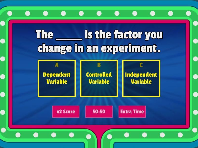 1) The _____ is the factor you change in an experiment. a) Dependent Variable b) Controlled Variable c) Independent Variable 2) Variables that we keep the same.. a) Controlled Variable b) independentIndependent Variable c) Dependent Variable 3) The _________ is the factor that you measure in response to the independent variable. a) Dependent Variable b) Independent Variable c) Controlled Variable 4) In a study to determine how the TEMPERATURE OF THE ROOM impacts a PLANT'S GROWTH, the INDEPENDENT variable is.. a) amount of growth b) the temperature of the room c) type of plant d) amount of light 5) In a study to determine how the TEMPERATURE OF THE ROOM impacts a PLANT'S GROWTH, the DEPENDENT variable is... a) amount of growth b) the temperature of the room c) type of plant d) amount of light 6) What is being measured/observed? a) independent variable b) dependent variable c) constant variable 7) What is changed or different? a) independent variable b) dependent variable c) constant variable 8) How many independent variable are allowed in an experiment? a) Three b) Two c) One 9) Max takes his skateboard to the top of a hill. He has friends of different weights ride down the hill one at a time. He tracks the time it takes them to get down the hill. What is the Independent Variable? a) Weight of Rider b) Hill c) Time to get down the hill 10) Max takes his skateboard to the top of a hill. He has friends of different weights ride down the hill one at a time. He tracks the time it takes them to get down the hill. What is the Dependent Variable? a) Weight of Rider b) Hill c) Time to get down the hill 11) Max takes his skateboard to the top of a hill. He has friends of different weights ride down the hill one at a time. He tracks the time it takes them to get down the hill. What is the Control Variable? a) Weight of Rider b) Hill & Skateboard c) Time to get down the hill 12) Anna wants to replicate the Mentos and Coke experiment she saw on YouTube. She buys three 2-liter bottles of Coke. In the first on, she puts 2 Mentos. In the second, she puts 4 Mentos. In the last, she puts 10 Mentos. She records how high the Coke gushes out of each bottle. What is the Independent Variable in this experiment? a) Amount of Coke b) Amount of Mentos c) Height of Coke Gush 13) Anna wants to replicate the Mentos and Coke experiment she saw on YouTube. She buys three 2-liter bottles of Coke. In the first on, she puts 2 Mentos. In the second, she puts 4 Mentos. In the last, she puts 10 Mentos. She records how high the Coke gushes out of each bottle. What is the Dependent Variable in this experiment? a) Amount of Coke b) Amount of Mentos c) Height of Coke Gush 14) Anna wants to replicate the Mentos and Coke experiment she saw on YouTube. She buys three 2-liter bottles of Coke. In the first on, she puts 2 Mentos. In the second, she puts 4 Mentos. In the last, she puts 10 Mentos. She records how high the Coke gushes out of each bottle. What is the Control Variable in this experiment? a) Amount of Coke b) Amount of Mentos c) Height of Coke Gush
