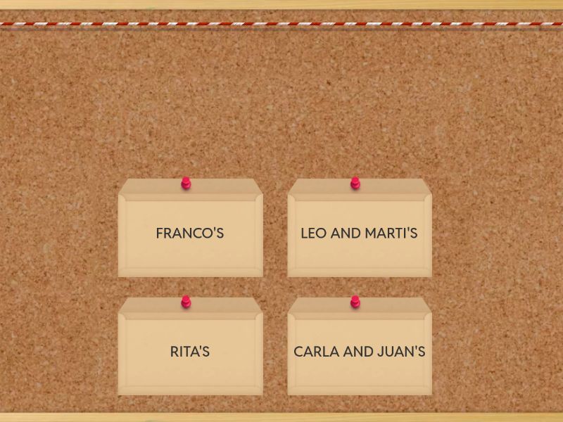FRANCO'S: , , , , LEO AND MARTI'S: , , , , RITA'S: , , , , CARLA AND JUAN'S: , , , ,