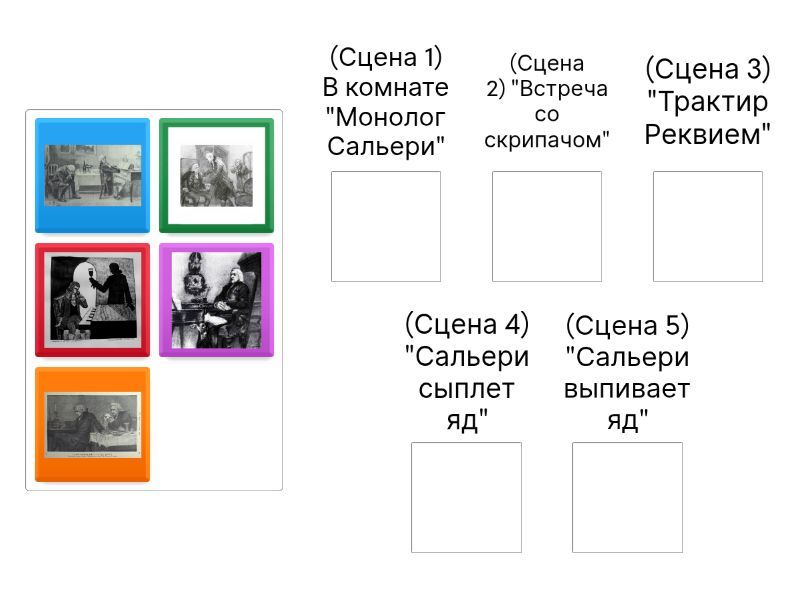 (Сцена 1) В комнате "Монолог Сальери": , (Сцена 2) "Встреча со скрипачом": , (Сцена 3) "Трактир Реквием": , (Сцена 4) "Сальери сыплет яд": , (Сцена 5) "Сальери выпивает яд": ,