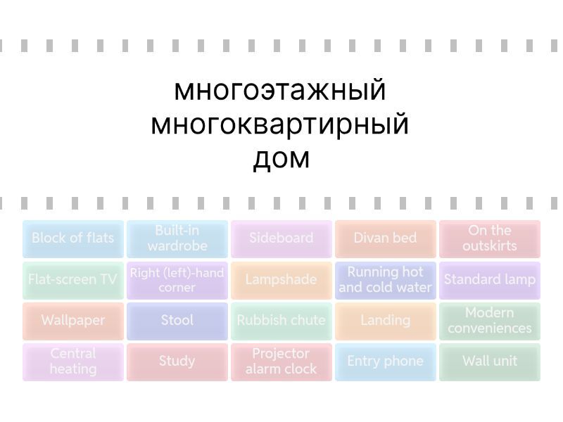 Block of flats - многоэтажный многоквартирный дом, On the outskirts - на окраине, Landing - межквартирная лестничная площадка, Modern conveniences - современные удобства, Central heating - центральное отопление, Running hot and cold water - водопровод горячей и холодной воды , Rubbish chute - мусоропровод, Wallpaper - обои, Right (left)-hand corner - правый (левый) угол, Entry phone - домофон, Study - кабинет, Lampshade - абажур, Wall unit - стенка, Sideboard - сервант, Stool - табурет, Flat-screen TV - плоский (ж/к) телевизор, Divan bed - диван-кровать, Standard lamp - торшер, Built-in wardrobe - встроенный шкаф, Projector alarm clock - будильник-проектор,