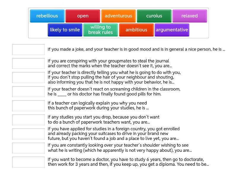 ambitious - If you want to become a doctor, you have to study 6 years, then go to doctorate, then work for 3 years and then, if you keep up, you get a diploma. You need to be... , rebellious - If any studies you start you drop, because you don´t want to do a bunch of paperwork teachers want, you are..., adventurous - If you have applied for studies in a foreign country, you got enrolled and already packing your suitcases to drive in your brand new future, but you haven´t found a job and a place to live yet, you are..., argumentative - If a teacher can logically explain you why you need this bunch of paperwork during your studies, he is ... , willing to break rules - If you are conspiring with your groupmates to steal the journal and correct the marks when the teacher doesn´t see it, you are... , curoius - If you are constantly looking over your teacher´s shoulder wishing to see what he is writing (which he apparently is not very happy about), you are... , likely to smile - If you made a joke, and your teacher is in good mood and is in general a nice person, he is ..., relaxed - If your teacher doesn´t react on screaming children in the classroom, he is ____ or his doctor has finally found good pills for him., open - If your teacher is directly telling you what he is going to do with you, if you don´t stop pulling the hair of your neighbour and shouting, also informing you that he is not happy with your behavior, he is...,