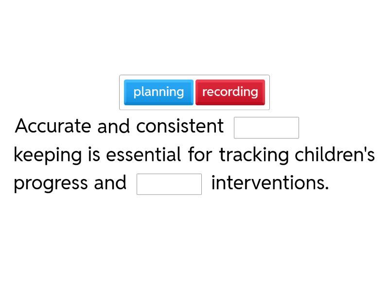 Accurate and consistent ____ keeping is essential for tracking children's progress and ____ interventions. Records should be factual, ____, and ____, reflecting what the child actually does. Observations, progress ____, assessment records, and review/transition documents are all types of ____. In the EYFS, records should track progress across the 7 areas of ____ and ____. Records must be ____ securely and in line with ____ regulations. Impact from ____ should be included to ensure the ____ voice is considered. Regularly reviewing records ensures ____ are effective and informs the next ____ of the Graduated Approach. Local Authority requirements may include using specific templates and ensuring records are ____ to relevant staff and ____. Progress trackers and SEN ____ help identify patterns, barriers, and next ____ for the child. Best practice in record keeping links each record to the Graduated Approach stages: ____, Plan, ____, Review.