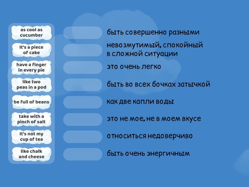 as cool as cucumber - невозмутимый, спокойный в сложной ситуации, like two peas in a pod - как две капли воды, like chalk and cheese - быть совершенно разными, It's not my cup of tea - это не мое, не в моем вкусе, take with a pinch of salt - относиться недоверчиво, have a finger in every pie - быть во всех бочках затычкой, be full of beans - быть очень энергичным, It's a piece of cake - это очень легко,