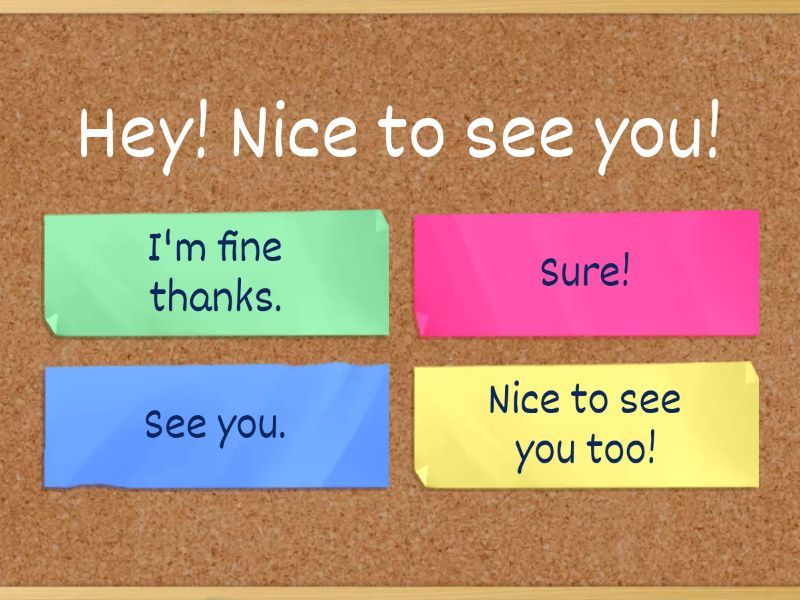 1) Hey! Nice to see you! a) I'm fine thanks.  b) Sure! c) See you. d) Nice to see you too! 2) How are you?  a) I'm sorry. I'm buzy at half past twelve. Can we meet at one o'clock? b) I'm fine thanks.  c) How about sandwiches? d) See you. 3) Great! Let's do something! Do you want to go  for lunch today? a) Nice to see you too! b) Let's go to a pizzeria. c) Sure! d) I'm fine thanks.  4) Great! Where would you like to go?  a) Nice to see you too! b) I'm fine thanks.  c) Let's go to a pizzeria. d) See you. 5) Sorry! I don't want pizza. How about somwhere else? a) Nice to see you too! b) Sure! c) I'm fine thanks.  d) How about sandwiches? 6) Sure! Can we meet at half past twelve?  a) I'm sorry. I'm buzy at half past twelve. Can we meet at one o'clock? b) Nice to see you too! c) See you. d) I'm fine thanks.  7) OK. See you then.  a) Sure! b) How about sandwiches? c) See you. d) I'm fine thanks.