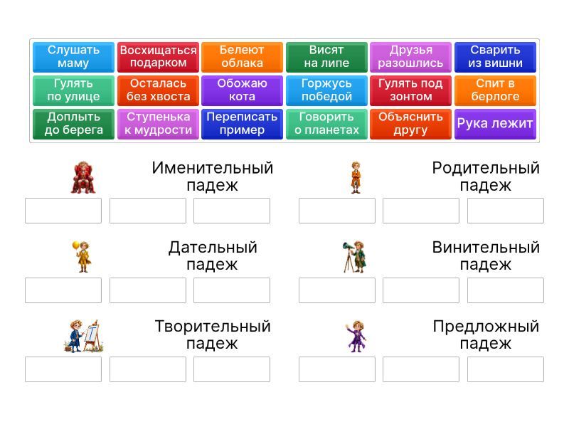 Именительный падеж: Белеют облака, Рука лежит, Друзья разошлись, Родительный падеж: Осталась без хвоста, Сварить из вишни, Доплыть до берега, Дательный падеж: Объяснить другу, Ступенька к мудрости, Гулять по улице, Винительный падеж: Обожаю кота, Слушать маму, Переписать пример, Творительный падеж: Восхищаться подарком, Горжусь победой, Гулять под зонтом, Предложный падеж: Висят на липе, Спит в берлоге, Говорить о планетах,