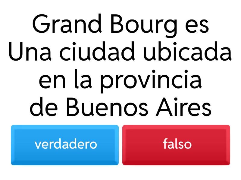 1) Grand Bourg es Una ciudad ubicada en la provincia de Buenos Aires a) verdadero b) falso 2) Grand Bourg es la ciudad mas poblada del partido de Malvinas Argentinas a) verdadero b) falso 3) Grand Bourg se encuentra a 30 km del Centro de la ciudad de Buenos Aires a) verdadero b) falso 4) Grand Bourg es Una ciudad que se encuentra en la Costa atlàntica Argentina a) verdadero b) falso 5) El partido de Malvinas Argentinas se encuentra en El gran Buenos Aires a) verdadero b) falso 6) La ciudad de grand Bourg existe desde 1989? a) falso b) verdadero 7) ¿Es verdad que hay Una escuela llamada Domingo fautismo Sarmiento? a) verdadero b) falso 8) ¿Es verdad que hay 85mil habitantes? a) verdadero b) falso 9) ¿es verdad que el Palacio municipal esta en grand bour? a) falso b) verdadero