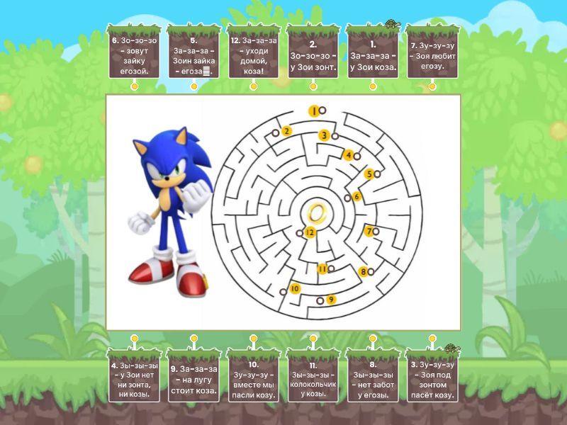1. За-за-за - у Зои коза., 2. Зо-зо-зо - у Зои зонт. , 3. Зу-зу-зу - Зоя под зонтом пасёт козу., 4. Зы-зы-зы - у Зои нет ни зонта, ни козы., 5. За-за-за - Зоин зайка - егоза́., 6. Зо-зо-зо - зовут зайку егозой. , 7. Зу-зу-зу - Зоя любит егозу., 8. Зы-зы-зы - нет забот у егозы. , 9. За-за-за - на лугу стоит коза. , 10. Зу-зу-зу - вместе мы пасли козу. , 11. Зы-зы-зы - колокольчик у козы. , 12. За-за-за - уходи домой, коза!.