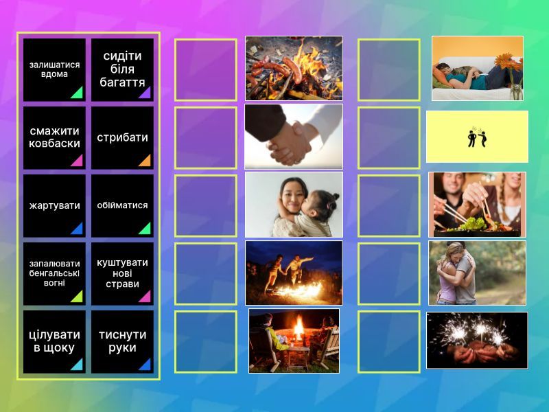 жартувати, залишатися вдома, запалювати бенгальські вогні, куштувати нові страви, обійматися, тиснути руки, стрибати, цілувати в щоку, сидіти біля багаття, смажити ковбаски,