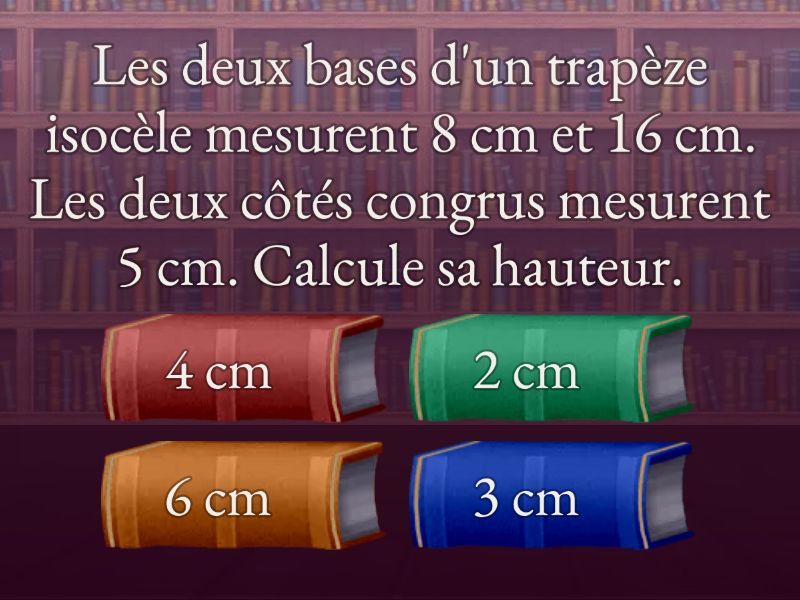 1) Les diagonales d'un losange mesurent 12cm et 16cm. Calcule son périmètre. a) 40 cm b) 28 cm c) 32 cm d) 48 cm 2) Les diagonales d'un carré mesurent 8cm. Calcule son côté. a) 2√6 cm b) √32 cm c) 4√2 cm d) √22cm 3) Le côté d'un losange est de 15cm et l'une de ses diagonales mesure 24cm. Quelle est la mesure de la deuxième diagonale? a) 18 cm b) 20 cm c) 22 cm d) 16 cm 4) Les côtés d'un triangle équilatéral mesurent 8cm. Que mesure sa hauteur? a) √38 cm b) √44 cm c) 4√3 cm d) √48 cm 5) Les diagonales d'un losange mesurent 32cm et 24cm. Quelle est la mesure de son périmètre? a) 90 cm b) 72 cm c) 80 cm d) 60 cm 6) Un rectangle a une diagonale qui mesure 10cm et sa longueur est de 8cm. Quelle est sa largeur? a) 6 cm b) 14 cm c) 10 cm d) 8 cm 7) Un trapèze rectangle a une hauteur de 5cm et ses deux bases mesurent 2cm et 14cm. Calcule son périmètre. a) 24 cm b) 44 cm c) 38 cm d) 34 cm 8) Les deux côtés congrus d'un triangle isocèle mesurent 15cm et sa hauteur est de 9cm. Quelle est la mesure de son périmètre? a) 54 cm b) 52 cm c) 24 cm d) 44 cm 9) Les deux bases d'un trapèze isocèle mesurent 8 cm et 16 cm. Les deux côtés congrus mesurent 5 cm. Calcule sa hauteur. a) 4 cm b) 3 cm c) 2 cm d) 6 cm 10) Un carré a un périmètre de 12 cm. Quelle est la mesure de sa diagonale? a) √18 cm b) 2√3 cm c) 5√6 cm d) 3√2 cm 11) Les côtés congrus d'un triangle isocèle mesurent 10cm. Quelle est la mesure de sa base si sa hauteur est de 8cm? a) 12 cm b) 14 cm c) 10 cm d) 8 cm