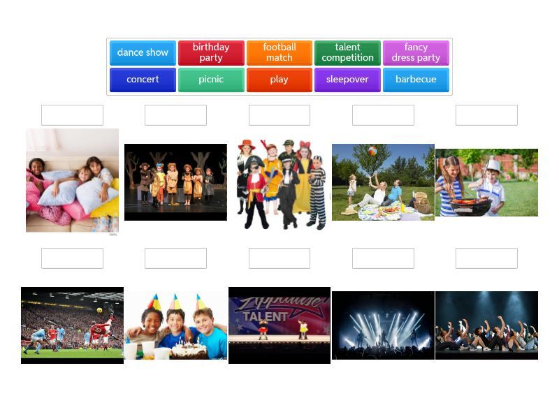 barbecue, birthday party, concert, dance show, football match, fancy dress party, picnic, play, sleepover, talent competition,