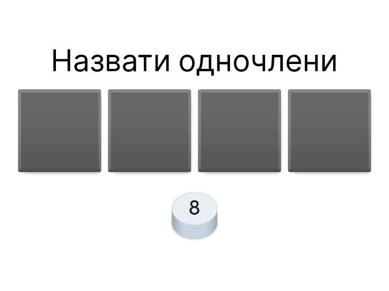 1) Назвати одночлени a) 5х+3у b) 16х c) 48с6а4 + 6с2а d) 5х - 3у 2) Назвати одночлен a) 4(5cb) b) 5у3 – 7у 3) Стандартний вигляд одночлена a) 64x6z4 : 16x4b3 b) 25ху3 4) Стандартний вигляд одночлена a) 70a6b4 b) 10ab47a5 5) Стандартний вигляд одночлена a) 45ac * 2ac6 b) 90а2с7 6) Стандартний вигляд одночлена (10х3у7)2 a) 100х6у14 b) 20х5у9 7) Стандартний вигляд одночлена 24zx * 2zxy a) 48х2zy b) 48х2z2y 8) Назвати одночлени a) 14ab4 * 7a6b b) 14ab4 + 7a6b 9) Стандартний вигляд одночлена 35у5 : 7у a) 5y4 b) 28y6 10) Назвати одночлен a) 18xyz - 5xy b) 18xyz