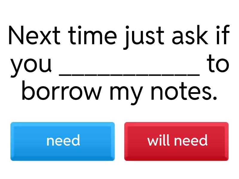 1) Next time just ask if you ___________ to borrow my notes. a) need b) will need 2) I'm a bit stressed because if I _________ this module, I fail the whole course. a) fail  b) will fail 3) I usually find if I don't revise my notes straight after class, I __________ most of it. a) forget b) will forget 4) If you're finding the course difficult, __________ your teacher. a) you tell b) you will tell 5) He's so annoying. If I tell him to be quiet he always __________ me. a) will ignore b) ignores 6) I got good mark on my coursework so I'll definitely pass ________ I mess up the exam really badly. a) if b) unless