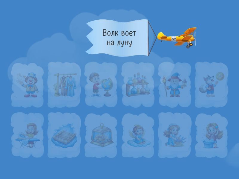 Волк воет на луну, Слава показал на глобус, Ангел сел на облако, По волнам плывёт плот, На полке колбы, В шкатулке золото, Влада нашла лаванду, Камила гладила полотенце, Злата мыла волосы, На вешалке весят халаты, У волшебника лампа и факел, У клоуна белый голубь,