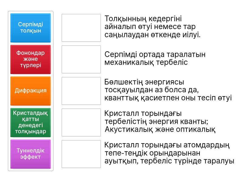 Кристалдық қатты денедегі толқындар - Кристалл торындағы атомдардың тепе-теңдік орындарынан ауытқып, тербеліс түрінде таралуы, Фонондар және түрлері - Кристалл торындағы тербелістің энергия кванты; Акустикалық және оптикалық, Серпімді толқын - Серпімді ортада таралатын механикалық тербеліс, Туннелдік эффект - Бөлшектің энергиясы тосқауылдан аз болса да, кванттық қасиетпен оны тесіп өтуі, Дифракция - Толқынның кедергіні айналып өтуі немесе тар саңылаудан өткенде иілуі.,