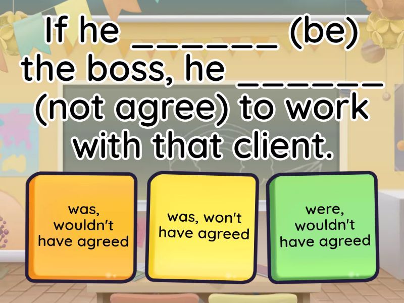 1) If he ______ (be) the boss, he ______ (not agree) to work with that client. a) was, wouldn't have agreed b) was, won't have agreed c) were, wouldn't have agreed 2) If he _____ (put) his computer away, it _____ (not be) damaged. a) had put, wouldn't be b) had putted, wouldn't be c) had put, wouldn't have been  3) If you ____ (take) the train insted of the bus, you _____ (be) at home. a) have taken, would be b) had taken, would have been c) had taken, would be  4) If Amanda _______ (have) three children, she ______ (need) to buy a new car. a) had, would have needed b) had, would had needed c) had have, would have needed 5) If we ________ (go) to the beach, we _______ (still / be) there now. a) have gone, would still be b) had gone, would still be c) have gone, would still been 6) If he _____ (know) more about history, he ______ (win) the quiz last week. a) known, would have won b) had knew, would have won c) knew, would have won 7) If my son _____ (put) his toys away, the toy car _____ (not be) broken. a) had put, wouldn't had been b) had put, wouldn't been c) had put, wouldn't have been 8) if David ____ (be) a teacher, he _____ (not take) so long to find a job. a) was, wouldn't have taken b) were, wouldn't have taken c) was, wouldn't had taken 9) If our flat ______ (not be) so far away, I ______ (stay) later last night. a) wasn't, wouldn't had stayed b) weren't, wouldn't have stayed c) wasn't, would stayed  10) If you _____ (live) in Athens, you _____ (study) Greek. a) lived, would have studied b) had lived, would have studied c) have lived, would have studied