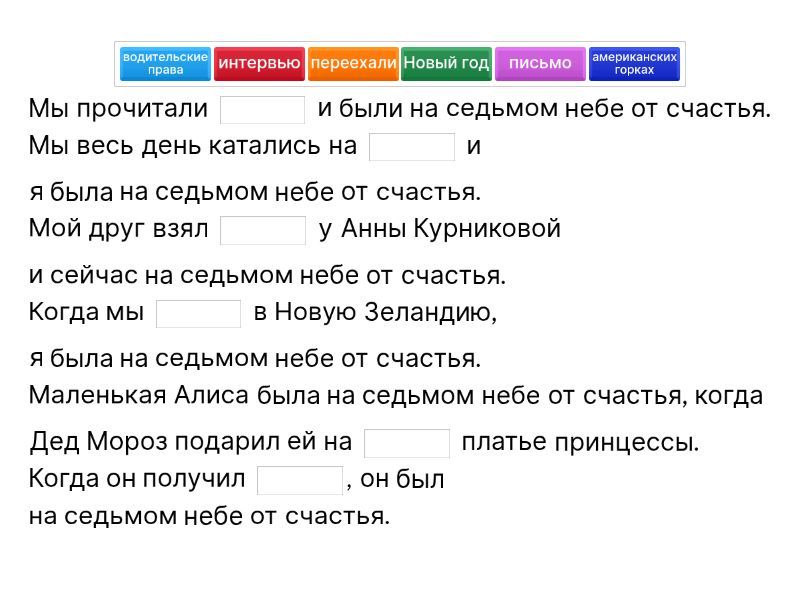 Мы прочитали ____ и были на седьмом небе от счастья. Мы весь день катались на ____ и я была на седьмом небе от счастья. Мой друг взял ____ у Анны Курниковой и сейчас на седьмом небе от счастья. Когда мы ____ в Новую Зеландию, я была на седьмом небе от счастья. Маленькая Алиса была на седьмом небе от счастья, когда Дед Мороз подарил ей на ____ платье принцессы. Когда он получил ____, он был на седьмом небе от счастья.