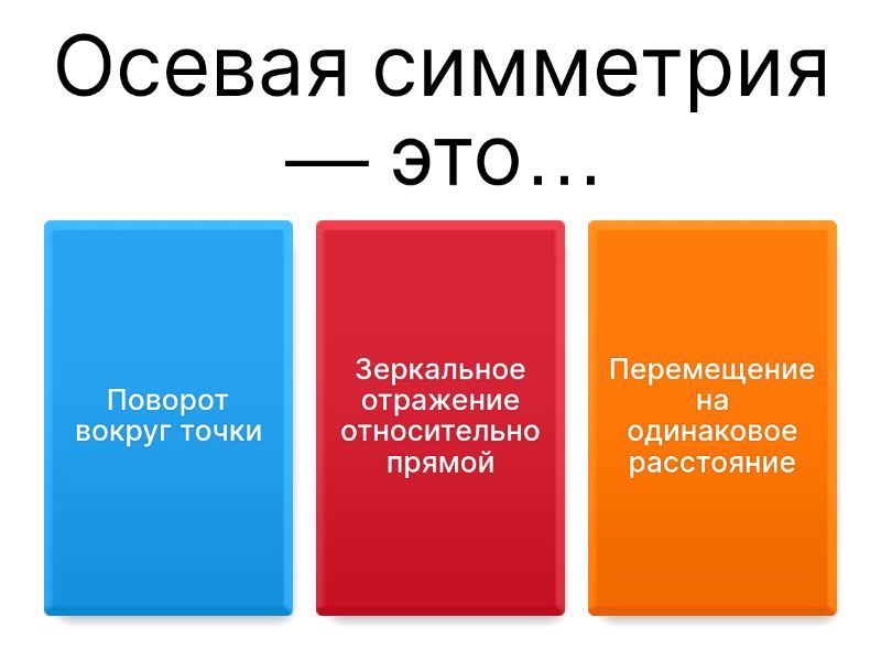 1) Осевая симметрия — это… a) Поворот вокруг точки b) Зеркальное отражение относительно прямой c) Перемещение на одинаковое расстояние 2) Как называется прямая, относительно которой строят симметрию? a) Переносная линия b) Ось симметрии c) Центр симметрии 3) Центр симметрии — это… a) Точка пересечения сторон b) Точка, относительно которой строится симметрия c) Средняя точка отрезка 4) Какие фигуры являются центрально-симметричными? a) Окружность и квадрат b) Ромб и круг c) Квадрат и круг 5) Центр симметрии — это… a) Отражение относительно прямой b) Отражение относительно точки c) Поворот на 90°