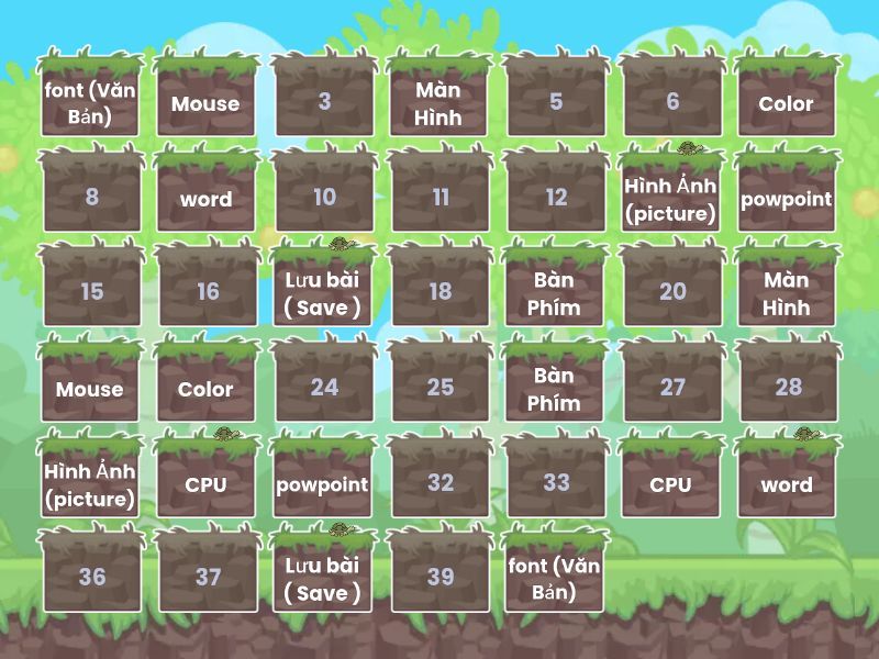 Mouse - Mouse, Bàn Phím - Bàn Phím, Màn Hình - Màn Hình, CPU - CPU, word - word, powpoint - powpoint, Lưu bài ( Save ) - Lưu bài ( Save ), Hình Ảnh (picture) - Hình Ảnh (picture), font (Văn Bản) - font (Văn Bản), Color - Color, insert - insert, Paint - Paint, Dán (ctrl + V) - Dán (ctrl + V), Sao chép (ctrl + C) - Sao chép (ctrl + C), Time New Roman - Time New Roman, Cỡ chữ ( 14 ) - Cỡ chữ ( 14 ), Hiệu ứng slide (transition) - Hiệu ứng slide (transition), Hiệu ứng chuyển động (Animation) - Hiệu ứng slide (Animation), ctrl + B (In đậm) - ctrl + B (In đậm), ctrl + I (In nghiên) - ctrl + I (In nghiên),