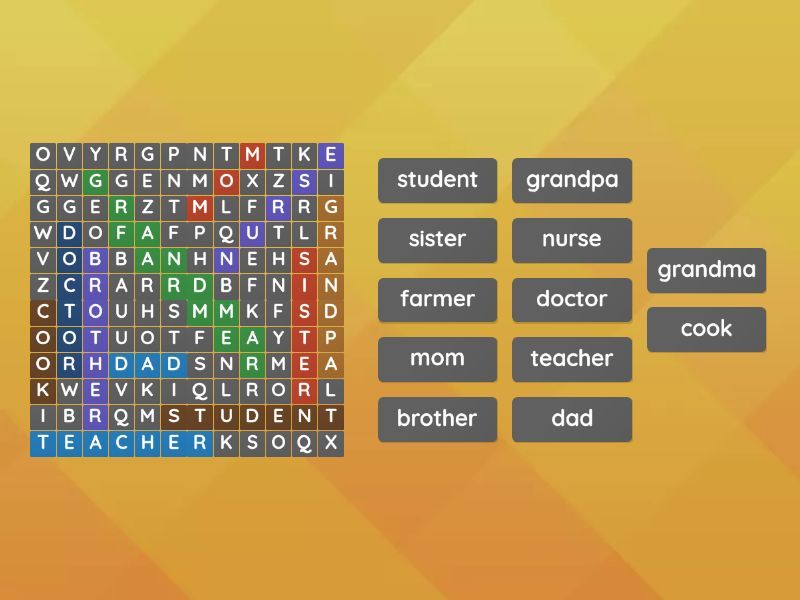 farmer - farmer, brother - brother, sister - sister, teacher - teacher, cook - cook, doctor - doctor, grandpa - grandpa, grandma - grandma, nurse - nurse, mom - mom, dad - dad, student - student,