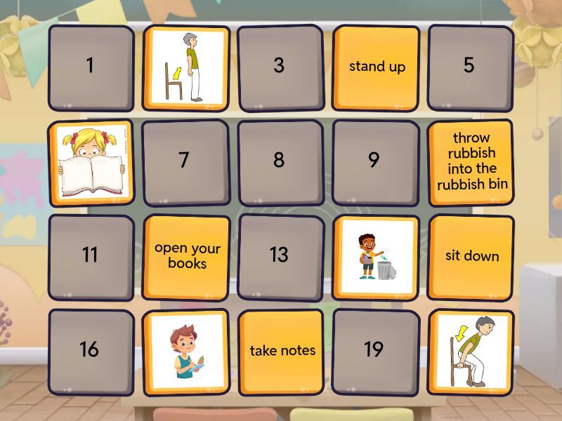 stand up, sit down, take notes, open your books, throw rubbish into the rubbish bin, raise your hand, listen to the teacher, point at the board, be quiet, pack your bag,