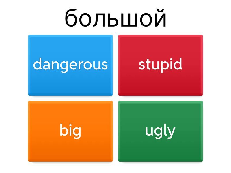 1) большой a) dangerous b) stupid c) big d) ugly 2) маленький (по возрасту) a) ugly b) angry c) dirty d) little 3) маленький (по размеру) a) small b) old c) clever d) kind 4) счастливый a) thin b) happy c) weak d) short 5) грустный a) sad b) thick c) short d) big 6) старый a) strong b) weak c) funny d) old 7) молодой a) strong b) dirty c) young d) thick 8) новый a) clever b) nice c) new d) small 9) сильный a) beautiful b) funny c) strong d) new 10) слабый a) weak b) stupid c) dirty d) fat 11) красивый a) nice b) thick c) short d) tall 12) страшный, ужасный, кошмарный a) cute b) terrible c) strong d) young 13) хороший a) tall b) short c) stupid d) good 14) злой a) ugly b) tall c) old d) angry 15) смешной a) long b) happy c) funny d) small 16) гадкий, уродливый a) clever b) ugly c) kind d) little 17) длинный a) long b) weak c) good d) strong 18) короткий a) short b) fat c) beautiful d) terrible 19) чистый a) fat b) clean c) long d) old 20) грязный a) beautiful b) clean c) young d) dirty 21) умный a) thick b) angry c) clever d) cute 22) глупый a) clean b) old c) strong d) stupid 23) толстый, жирный a) fat b) weak c) old d) terrible 24) тонкий a) fat b) beautiful c) thin d) ugly 25) толстый a) thin b) thick c) weak d) old 26) добрый (душой) a) little b) fat c) kind d) angry 27) опасный a) dirty b) dangerous c) kind d) thin 28) высокий a) nice b) little c) tall d) long 29) симпатичный, прелестный a) funny b) big c) cute d) good 30) красивый, прекрасный, чудесный a) cute b) beautiful c) kind d) strong