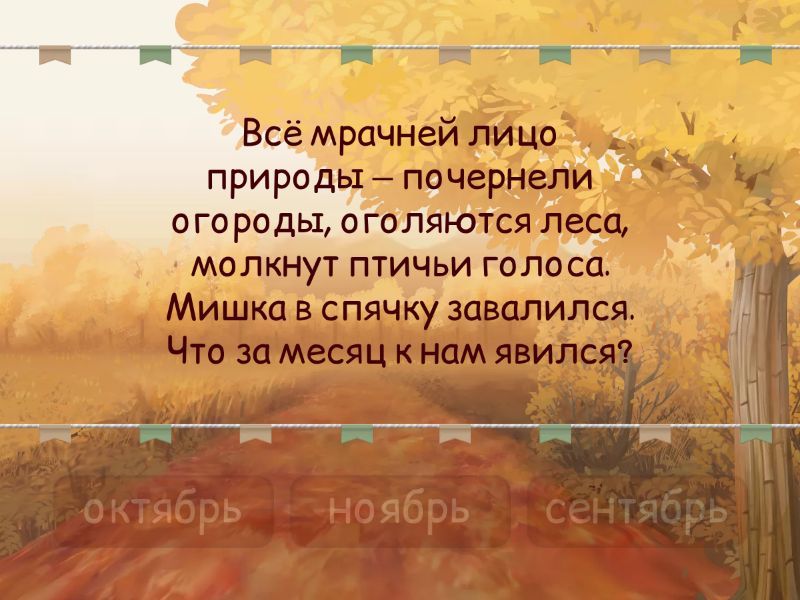 октябрь - Всё мрачней лицо природы – почернели огороды, оголяются леса,  молкнут птичьи голоса. Мишка в спячку завалился. Что за месяц к нам явился? , сентябрь - Опустел наш школьный сад, паутинки вдаль летят, и на южный край земли потянулись журавли. Распахнулись двери школ. Что за месяц к вам пришёл? , ноябрь - Поле чёрно-белым стало, Падает то дождь, то снег. А ещё похолодало, Льдом сковало воды рек. Мёрзнет в поле озимь ржи. Что за месяц, подскажи. ,
