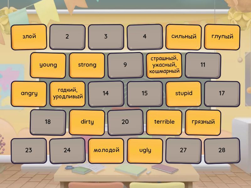 young - молодой, strong - сильный, terrible - страшный, ужасный, кошмарный, angry - злой, ugly - гадкий, уродливый, dirty - грязный, stupid - глупый, fat - толстый, жирный, thin - тонкий, thick - толстый, kind - добрый (душой), dangerous - опасный, tall - высокий, cute - симпатичный, прелестный,