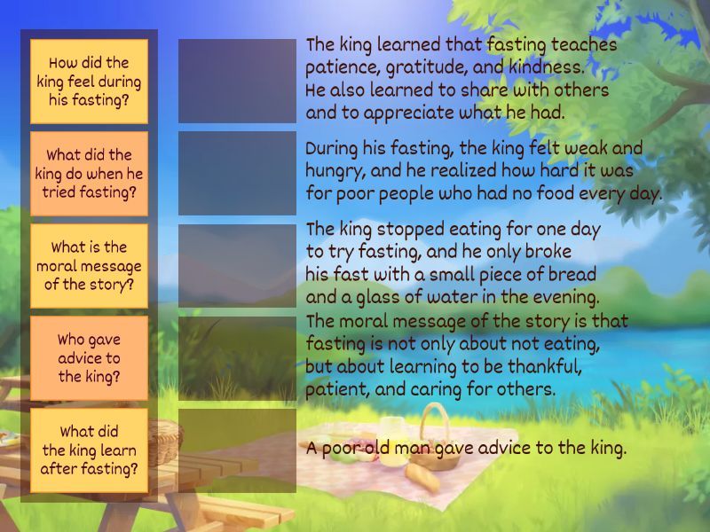 Who gave advice to the king? - A poor old man gave advice to the king., What did the king do when he tried fasting? - The king stopped eating for one day to try fasting, and he only broke his fast with a small piece of bread and a glass of water in the evening., How did the king feel during his fasting? - During his fasting, the king felt weak and hungry, and he realized how hard it was for poor people who had no food every day., What did the king learn after fasting? - The king learned that fasting teaches patience, gratitude, and kindness. He also learned to share with others and to appreciate what he had., What is the moral message of the story? - The moral message of the story is that fasting is not only about not eating, but about learning to be thankful, patient, and caring for others.,