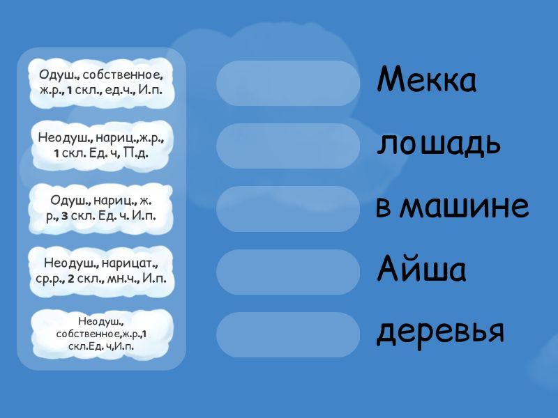 Неодуш., собственное,ж.р.,1 скл.Ед. ч,И.п. - Мекка, Одуш., нариц., ж. р., 3 скл. Ед. ч. И.п. - лошадь, Неодуш., нариц.,ж.р., 1 скл. Ед. ч, П.д. - в машине, Одуш., собственное, ж.р., 1 скл., ед.ч., И.п. - Айша, Неодуш., нарицат., ср.р., 2 скл., мн.ч., И.п. - деревья,