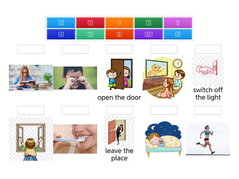 哭, 笑, 跑, 跳, 叫, 拍球, 开门 - open the door, 关门 - close the door, 开窗, 关灯 - switch off the light, 进来 - come in, 出去 - leave the place, 看书, 刷牙, 睡觉, 吃饭, 喝水, 踢球, 弹琴, 看电视,