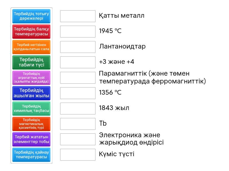 Тербийдің химиялық таңбасы - Tb, Тербийдің агрегаттық күйі (қалыпты жағдайда) - Қатты металл, Тербийдің балқу температурасы - 1356 °C, Тербийдің қайнау температурасы - 1945 °C, Тербийдің тотығу дәрежелері - +3 және +4, Тербий негізінен қолданылатын сала - Электроника және жарықдиод өндірісі, Тербийдің табиғи түсі - Күміс түсті, Тербий жататын элементтер тобы - Лантаноидтар, Тербийдің магнетикалық қасиетінің түрі - Парамагниттік (және төмен температурада ферромагниттік), Тербийдің ашылған жылы - 1843 жыл,
