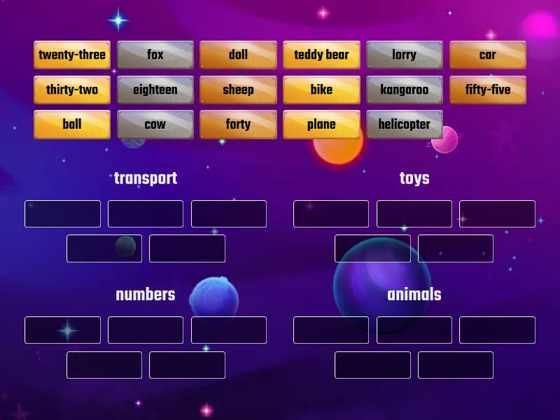 transport: car, lorry, helicopter, plane, bike, toys: teddy bear, ball, doll, numbers: forty, thirty-two, fifty-five, twenty-three, eighteen, animals: sheep, fox, kangaroo, cow,