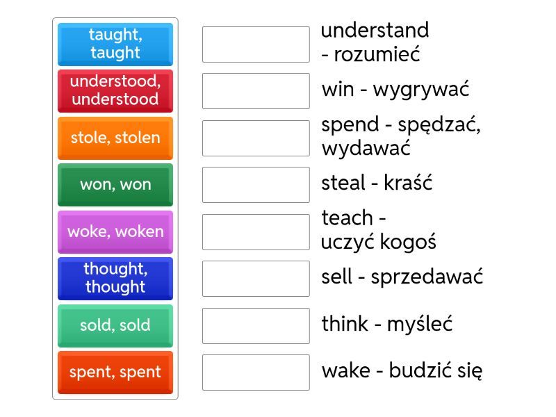 saw, seen - see - widzieć, sold, sold - sell - sprzedawać, sent, sent - send - wysyłać, set, set - set - ustawić, showed, shown - show - pokazać, sang, sung - sing - śpiewać, sat, sat - sit - siedzieć, slept, slept - sleep - spać, spoke, spoken - speak - mówić, spent, spent - spend - spędzać, wydawać, stood, stood - stand - stać, stole, stolen - steal - kraść, swept, swept - sweep - zamiatać, swam, swum - swim - pływać, wrote, written - write - pisać, won, won - win - wygrywać, wore, worn - wear - nosić, woke, woken - wake - budzić się, understood, understood - understand - rozumieć, thought, thought - think - myśleć, told, told - tell- powiedzieć, taught, taught - teach - uczyć kogoś, took, taken - take - brać,